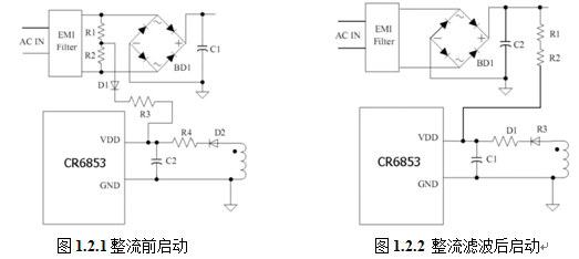 上面两种启动方式当电源上电开机时通过启动电阻 RIN 给 VDD 端的电容 C1 充电,直到 VDD 端口电