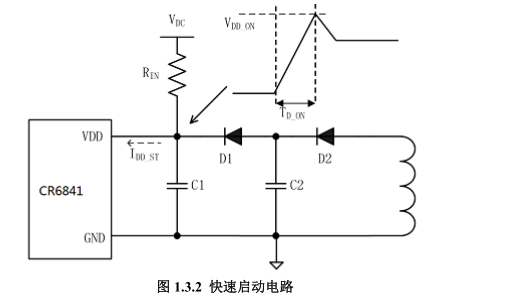 其中 I DD_ST 为 CR6841 的启动电流,T D_ON 为系统的启动延迟时间,R IN 为 R1 与 R2 电阻值之和